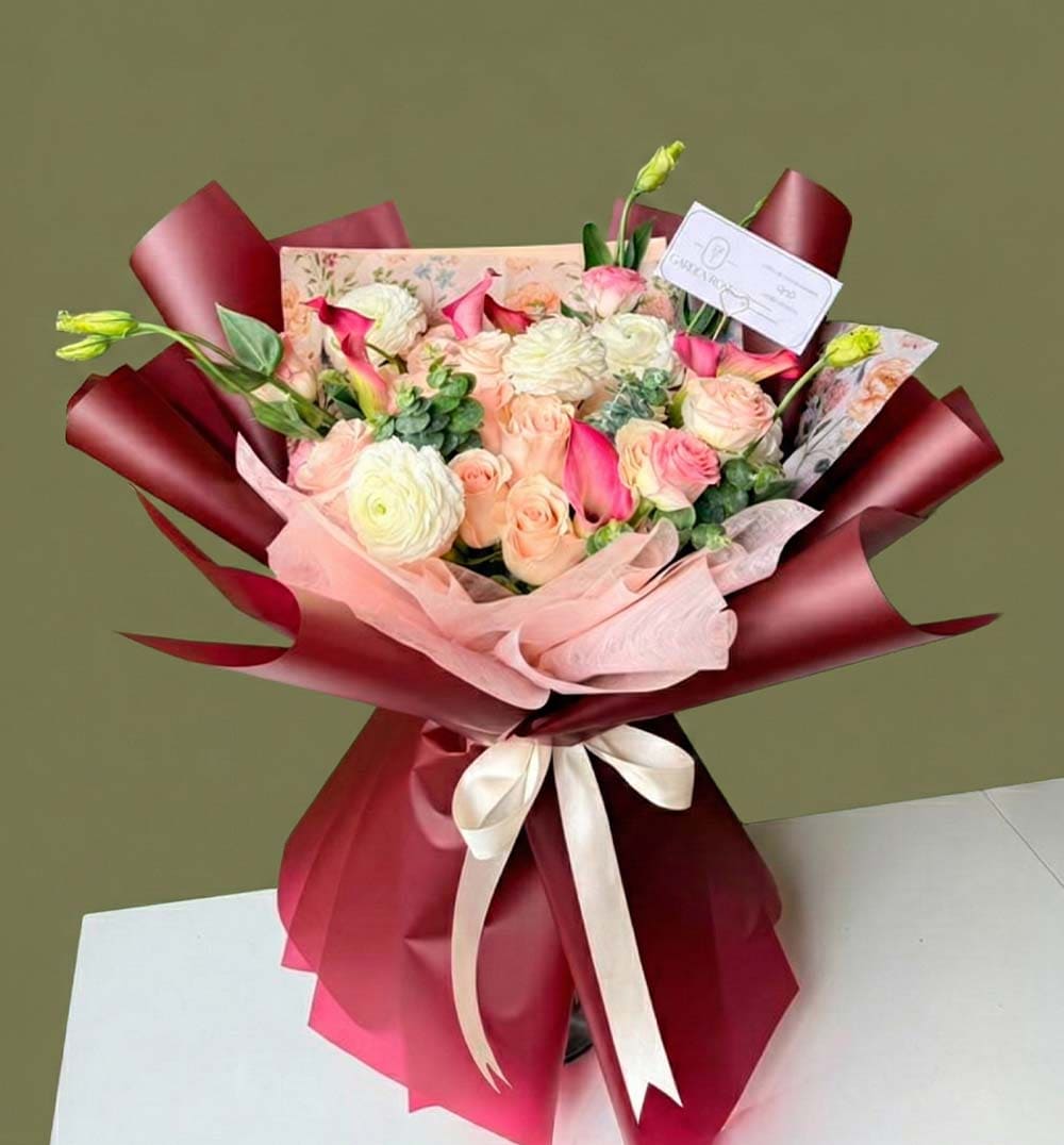 Aurora» es un exquisito arreglo floral que combina la delicadeza de rosas, ranúnculos y tulipanes en tonos suaves y armoniosos. Presentado en una elegante envoltura burdeos, este ramo irradia sofisticación y frescura. Perfecto para celebrar momentos especiales o expresar sentimientos profundos, «Aurora» transforma cualquier ocasión en un instante memorable, llenando el ambiente de belleza y alegría.