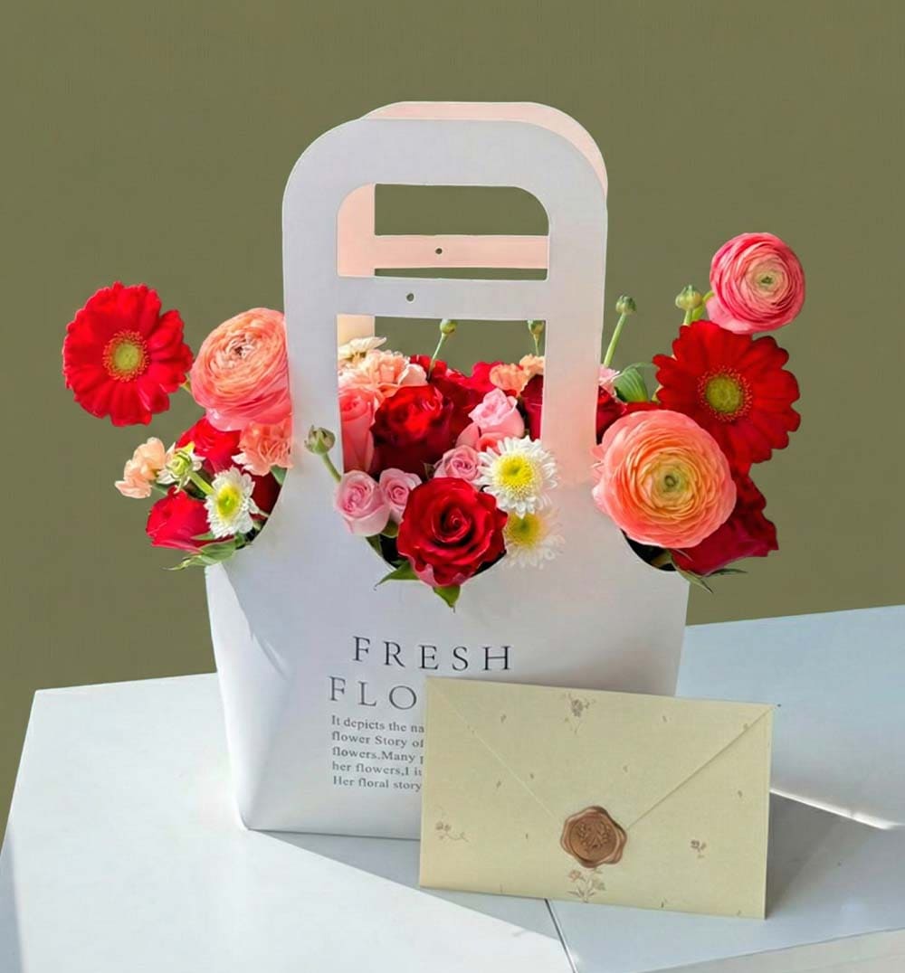 un encantador arreglo floral que combina ranúnculos y rosas en una elegante bolsa de flores. Perfecto para expresar tus sentimientos en ocasiones especiales, este arreglo resalta la frescura y la belleza de cada flor. Sorprende a esa persona especial con un regalo que hable desde el corazón.
