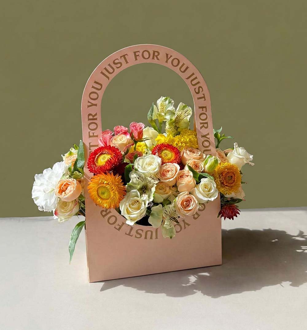 El Bolso Floral es un innovador y encantador arreglo que combina la belleza de las flores con un diseño único en forma de bolso. Este arreglo presenta una mezcla vibrante de flores, incluyendo rosas, gerberas y claveles, que añaden un toque de frescura y alegría. Ideal para expresar amor, amistad o gratitud, este bolso floral es una forma creativa de regalar flores.
