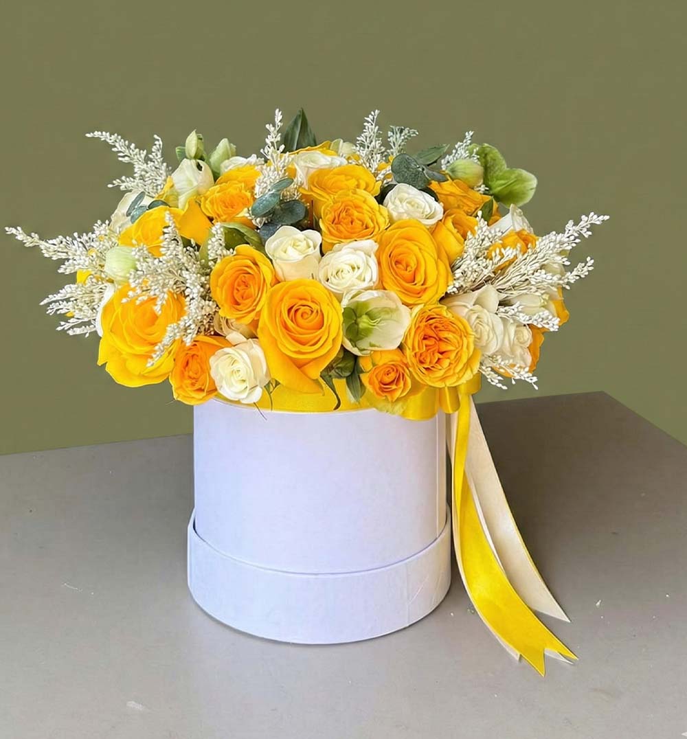 Este arreglo presenta una vibrante mezcla de rosas amarillas y flores blancas, evocando alegría y luz. Perfecto para celebrar momentos felices y añadir un toque cálido a cualquier espacio.