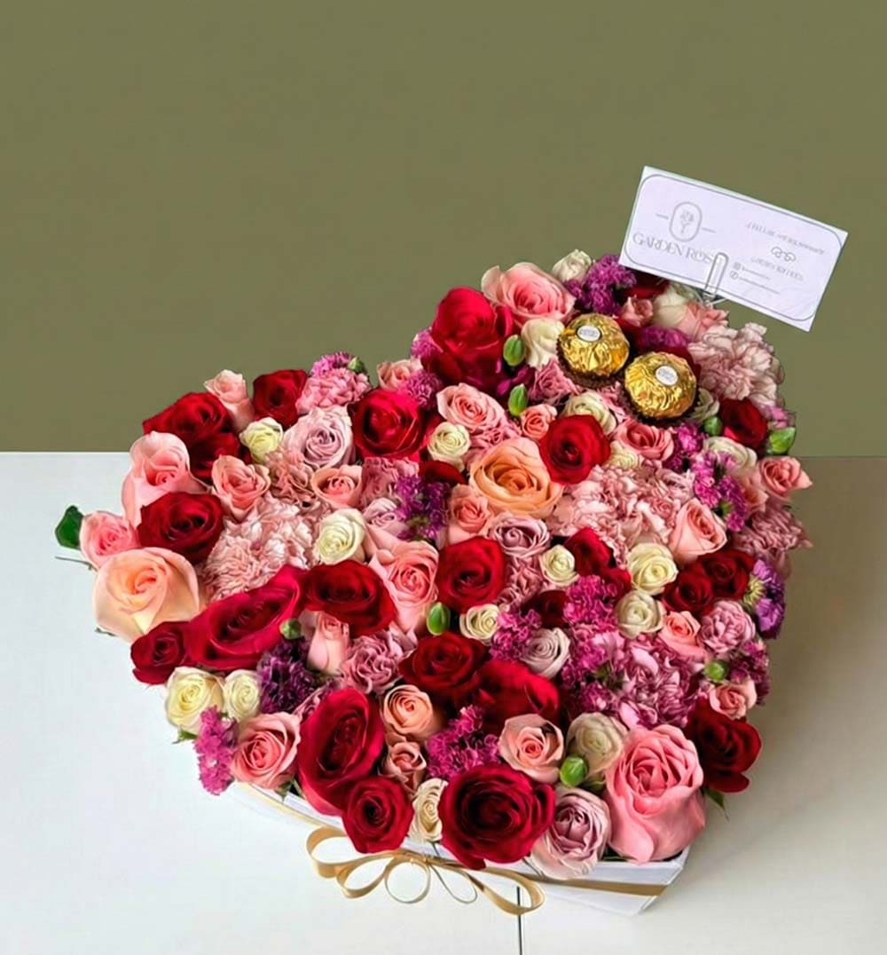 Corazón de Pasiones» es un impresionante arreglo floral en forma de corazón, elaborado con una vibrante mezcla de rosas en tonos rojos, rosas y morados. Cada flor se agrupa con cuidado, creando un espectáculo visual que evoca amor y emoción. Perfecto para expresar sentimientos profundos en ocasiones especiales, este arreglo no solo es un regalo, sino una declaración de amor que ilumina cualquier espacio con su belleza deslumbrante