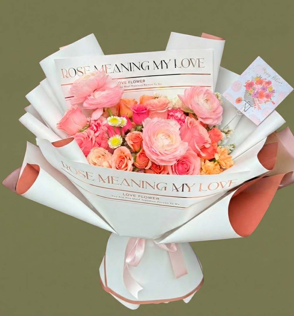 Un encantador bouquet que expresa sentimientos profundos. Compuesto por rosas y flores en tonos coral y rosa, este ramo incluye un mensaje especial que dice «Rose Meaning My Love». Ideal para sorprender a esa persona especial en tu vida, aportando un toque de romance y elegancia a cualquier ocasión.