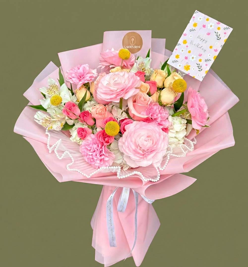 Un delicado bouquet que combina la belleza de rosas y claveles en tonos suaves de rosa, complementado con toques de flores amarillas y verdes. Su diseño fresco y vibrante no solo alegra el día de quien lo recibe, sino que también aporta un toque de elegancia a cualquier espacio.
